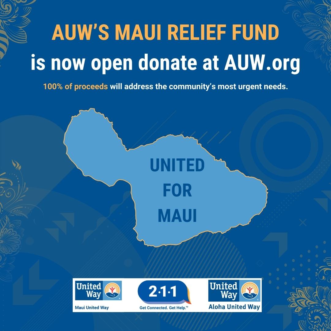 HONOLULU — To support individuals and families devastated by Maui’s catastrophic fires, Aloha United Way has established a Maui Fire Relief Fund on its website, AUW.org. 100% of proceeds are directed to Maui United Way whose partner agencies, such as Maui Food Bank, the Red Cross and the Salvation Army, are distributing relief funds according to the community’s most urgent needs.